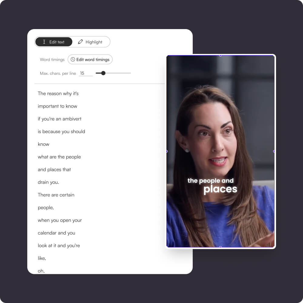 Instantly generate accurate AI captions for any video. Style, edit, highlight and animate text effortlessly to boost engagement on every platform.